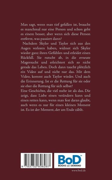 Man sagt, wenn man tief gefallen ist, braucht es manchmal nur eine Person und schon geht es einem besser, aber wenn sich diese Person entfernt, was passiert dann? Nachdem Skyler und Taylor sich aus den Augen verloren haben, widmet sich Skyler wieder ganz ihren Gefühlen und erleidet einen Rückfall. Sie rutscht ab, in die erneute Magersucht und erleichtert sich so nicht gerade das Leben. Doch dann taucht plötzlich ein Video auf und nicht nur das. Mit dem Video, kommt auch Taylor wieder. Und auch die Erinnerung. Ist er die Rettung für sie oder sie eher die Rettung für sich selbst?Eine Geschichte die viel mehr ist als das. Die zeigt, dass Liebe einen verändern kann und einen retten kann, wenn man fest daran glaubt, auch wenn es nur für einen kleinen Moment ist. Es ist der Moment, der am Ende zählt.