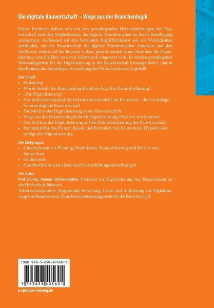 Dieses Fachbuch befasst sich mit den grundlegenden Herausforderungen der Bauwirtschaft und den Möglichkeiten, die digitale Transformation zu deren Bewältigung einzusetzen. Aufbauend auf den bekannten Begrifflichkeiten soll ein Weiterdenken stattfinden, wie die Bauwirtschaft die digitale Transformation umsetzen kann und den Einflüssen, welche auf die Branche wirken, gerecht werden kann, ohne dass die Digitalisierung ausschließlich zu deren Selbstzweck eingesetzt wird. Es werden grundlegende Notwendigkeiten für die Digitalisierung in der Bauwirtschaft herausgearbeitet und in den Kontext der zukünftigen Ausrichtung des Wirtschaftsbereichs gestellt.