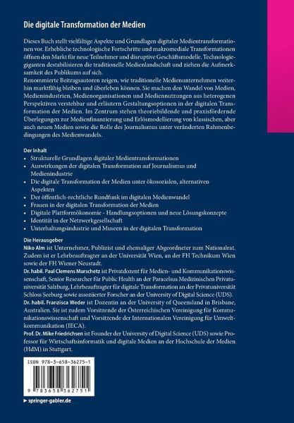 Dieses Buch stellt vielfältige Aspekte und Grundlagen digitaler Medientransformationen vor. Erhebliche technologische Fortschritte und makromediale Transformationen öffnen den Markt für neue Teilnehmer und disruptive Geschäftsmodelle. Technologiegiganten destabilisieren die traditionelle Medienlandschaft und ziehen die Aufmerksamkeit des Publikums auf sich.Renommierte Beitragsautoren zeigen, wie traditionelle Medienunternehmen weiterhin marktfähig bleiben und überleben können. Sie machen den Wandel von Medien, Medienindustrien, Medienorganisationen und Mediennutzungen aus heterogenen Perspektiven verstehbar und erläutern Gestaltungsoptionen in der digitalen Transformation der Medien. Im Zentrum stehen theoriebildende und praxisfördernde Überlegungen zur Medienfinanzierung und Erlösmodellierung von klassischen, aber auch neuen Medien sowie die Rolle des Journalismus unter veränderten Rahmenbedingungen des Medienwandels. Der Inhalt- Strukturelle Grundlagen digitaler Medientransformationen- Auswirkungen der digitalen Transformation auf Journalismus und Medienindustrie- Der öffentlich-rechtliche Rundfunk im digitalen Medienwandel- Frauen in der digitalen Transformation der Medien- Probleme in der Finanzierung von Medienangeboten- Digitale Plattformökonomie- Handlungsoptionen und neue Lösungskonzepte für Werbung- Die digitale Transformation der Medien unter ökosozialen, alternativen Aspekten- Identität in der Netzwerkgesellschaft- Desinformations-Kampagnen- Unterhaltungsindustrie und Museen in der digitalen Transformation