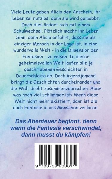 Viele Leute geben Alicia den Anschein, ihr Leben sei nutzlos, denn sie wird gemobbt. Doch dies ändert sich mit einem Schulwechsel. Plötzlich macht ihr Leben Sinn, denn Alicia erfährt, dass sie als einziger Mensch in der Lage ist, in eine wundervolle Welt - in die Dimension der Fantasien - zu reisen. In dieser geheimnisvollen Welt laufen alle je geschriebenen Geschichten in Dauerschleife ab. Doch irgendjemand bringt die Geschichten durcheinander und die Welt droht zusammenzubrechen. Aber was noch viel schlimmer ist: Wenn diese Welt nicht mehr existiert, dann ist die auch Fantasie in uns Menschen verloren. Das Abenteuer beginnt, denn wenn die Fantasie verschwindet, dann musst du kämpfen!