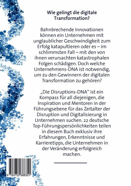 Wie gelingt die digitale Transformation?Bahnbrechende Innovationen können ein Unternehmen mit unglaublicher Geschwindigkeit zum Erfolg katapultieren oder es - im schlimmsten Fall - mit den von ihnen verursachten katastrophalen Folgen schädigen. Doch welche Unternehmens-DNA ist notwendig, um zu den Gewinnern der digitalen Transformation zu gehören?"Die Disruptions-DNA" ist ein Kompass für all diejenigen, die Inspiration und Mentoren in der Führungsebene für das Zeitalter der Disruption und Digitalisierung in Unternehmen suchen. 22 deutsche Top-Führungspersönlichkeiten teilen in diesem Buch exklusiv ihre Erfahrungen, Erkenntnisse und Karrieretipps, die Unternehmen in der Veränderung erfolgreich machen.