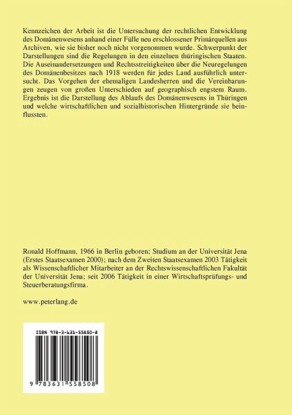 Aus dem Inhalt: Historische Entwicklung des Domänenwesens in Thüringen -Begriffe und umfangreiche Auswertung des Archivmaterials mit neu erschlossenen Rechtsquellen - Allgemeingeschichtlicher Überblick über die thüringischen Fürstenhäuser und die unterschiedlichen Regelungen bis zum 1. Weltkrieg - Darstellung der Auseinandersetzungen und Neuregelungen nach Ende der Monarchie - Streitigkeiten und Prozesse als Folge der Inflation - Erstmalige umfassende Analyse der thüringischen Domänenproblematik.