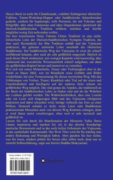 Dieses Buch ist nicht für Chinafreunde, verklärte Schöngeister tibetischer Folklore, Tantra-Workshop-Hopper oder buddhistische Sektenforscher gedacht, sondern für begünstigte, reife Personen, die mit Toleranz und Mitgefühl, aber ohne Fanatismus und ohne Dogmatismus spielerisch die tibetisch-buddhistischen Tradition erfahren möchten und hierfür möglichst wenig Zeit aufwenden wollen.Die hier konstituierte Dorje Tshomo Chime Tradition ist eine nicht-klösterliche Linie der tibetisch-buddhistischen Nyingma Tradition, die aber auch Bestandteile der Bön Tradition enthält und das Vajrayana praktiziert, die geheime tantrische Lehre innerhalb des tibetischen Buddhismus. Der buddhistische Weg des Vajrayana ist zwar als schnell zielführend bekannt, aber auch als sehr gefährlich eingestuft. Ähnlich ist auch dieses Buch strukturiert, mit wenigen Kapiteln wird kurzweilig, aber umfassend das wesentliche Wissensumfeld schnell aufgebaut, um dann die gefährlichen Kapitel besser und intensiver zu verstehen.Die Wahrscheinlichkeit, dass eine Leserin oder ein Leser sich hingezogen fühlt und das Vajrayana erfolgreich praktiziert und dabei erleuchtet wird, beträgt vielleicht nur Eins zu einer Million. Dennoch schadet es nicht, wenn Laien oder Buddhismus praktizierende Menschen auch von diesem Weg Kenntnis erlangen, denn er wird ihnen meist verschwiegen, eben weil er sehr mystisch und gefährlich ist. Lassen Sie sich durch die Manifestation der Meisterin Tulku Dawa Lhamo inspirieren und tauchen Sie ein in das absolut fremdartige tantrische Bewusstsein und in das noch tiefere Geheimnis des Vajrayana, in das zauberhafte Karmamudra. Das Wort Tibet wird für Sie künftig eine andere Bedeutung und Wertigkeit haben. Aber glauben Sie hier nichts, was Sie lesen, sondern prüfen Sie besser alles selber nach, denn nur so entsteht Selbsterfahrung, sagte uns bereits Buddha Shakyamuni.