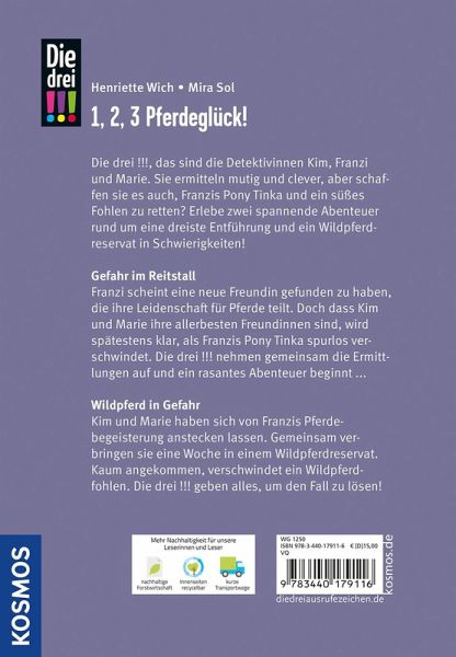 Nervenkitzel im Doppelpack! Kim, Franzi und Marie verbringen eine Ferienwoche im Wildpferdreservat. Sie sind noch nicht lange dort, als sehr seltsame Dinge geschehen: Pferde brechen aus und ein Fohlen verschwindet spurlos. Jemand hat wohl auch versucht, die Tiere zu vergiften. Wer steckt hier bloß dahinter? Auf einem Reiterhof wird Franzis Lieblingspony Tinka vermisst. Wo ist das Pony versteckt? Die Spur führt zum Hof der Konkurrenz. Zwei spannende Fälle für die Detektivinnen in einem Doppelband. Mutig und clever stellen sich die drei !!! den Herausforderungen und sind zusammen einfach ein unschlagbares Team.