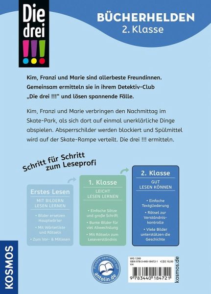 Wie sieht es denn hier schon wieder aus? Kim, Franzi und Marie trauen ihren Augen kaum: Der Skate-Park ist total verschmutzt! Die Freundinnen müssen erst einmal Müll wegräumen, bevor sie für den Skate-Wettbewerb trainieren können. Kann es sein, dass jemand extra die beliebte Anlage sabotiert? Warum sollen Kinder mit Scootern und Skateboards keinen Spaß haben dürfen? Die drei !!! zeigen ihr ganzes Detektivinnen-Können. Unterstützt werden die Mädchen in acht Kapiteln von Erstlesern ab der zweiten Klasse. Sie lesen die spannende Geschichte und lösen nach jedem Kapitel ein Rätsel.