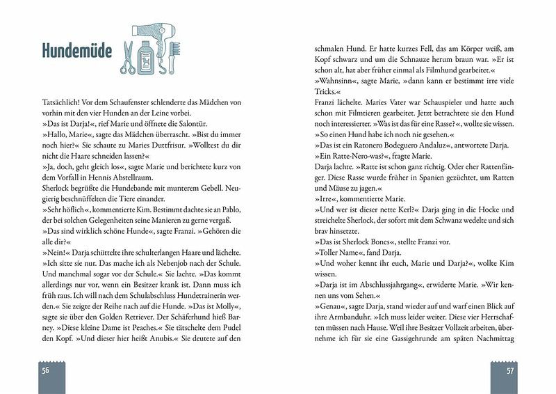 Überall Hunde! Auf einem Schulfest lernen die drei !!! Hundetrainerin Hanna und ihre Schulhündin Willa kennen. Kurze Zeit später häufen sich Diebstähle und Einbrüche in der Stadt. Kim, Marie und Franzi ermitteln! Sie befragen Zeugen und untersuchen die Tatorte. Es gibt immer eine Gemeinsamkeit: Alle haben Hunde gesehen. Wer steckt dahinter? Wird jemand erpresst? Die Detektivinnen haben bald eine Idee, wie sie den Übeltäter auf frischer Tat ertappen. Ein Krimi Abenteuer kombiniert mit Sachwissen. Doppelseiten am Ende der Kapitel mit Informationen, Fun Facts und praktischen Tipps rund um das Thema Hunde.