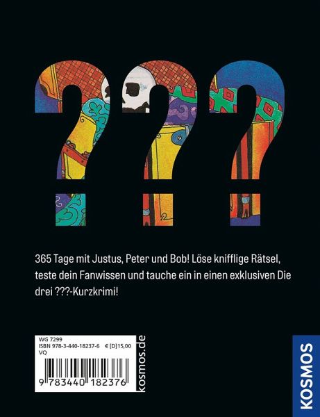 365 spannende Tage mit den drei ??? aus Rocky Beach. Welcher Fall beginnt mit diesen Sätzen? Wo verstecken sich wichtige Spuren? Aus welchem Band stammt dieser coole Spruch? Wo kam diese Diebin vor? Was führt Skinny Norris gerade im Schilde? Hier sind Spürsinn und Expertenwissen gefragt! Der Abreißkalender hält jeden Tag knifflige Aufgaben bereit. Jeden Sonntag wartet zudem die Fortsetzung einer exklusiven Kurzgeschichte. Mit zehn verschiedenen Rätselkategorien und Bilderrätseln. Mit den Kult-Detektiven Justus, Peter und Bob durch das Jahr - mit Zitaten, Bildern und Rätseln aus mehr als 200 Bänden.