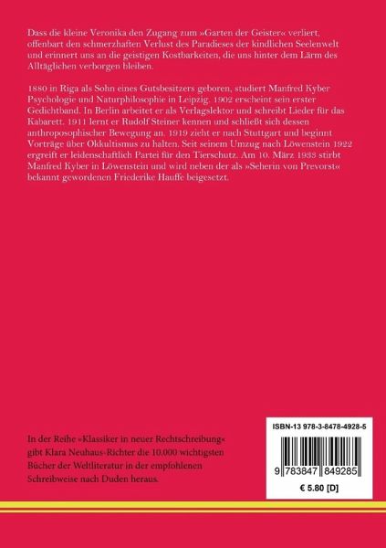 In der Reihe »Klassiker in neuer Rechtschreibung« gibt Klara Neuhaus-Richter die wichtigsten Bücher der Weltliteratur in der empfohlenen Schreibweise nach Duden heraus. Manfred Kyber: Die drei Lichter der kleinen Veronika. Ein spirituelles Märchen für Erwachsene Dass die kleine Veronika den Zugang zum »Garten der Geister« verliert, offenbart den schmerzhaften Verlust des Paradieses der kindlichen Seelenwelt und erinnert uns an die geistigen Kostbarkeiten, die uns hinter dem Lärm des Alltäglichen verborgen bleiben. Erstdruck: Grethlein, Leipzig/Zürich, 1929. Neu herausgegeben von Klara Neuhaus-Richter, Berlin 2021. Umschlaggestaltung von Rainer Richter unter Verwendung einer Porträtzeichnung von Josefine Weinschrott. Gesetzt aus der Minion Pro, 11 pt. Henricus - Edition Deutsche Klassik GmbH Über den Autor: 1880 in Riga als Sohn eines Gutsbesitzers geboren, studiert Manfred Kyber Psychologie und Naturphilosophie in Leipzig. 1902 erscheint sein erster Gedichtband. In Berlin arbeitet er als Verlagslektor und schreibt Lieder für das Kabarett. 1911 lernt er Rudolf Steiner kennen und schließt sich dessen anthroposophischer Bewegung an. 1919 zieht er nach Stuttgart und beginnt Vorträge über Okkultismus zu halten. Seit seinem Umzug nach Löwenstein 1922 ergreift er leidenschaftlich Partei für den Tierschutz. Am 10. März 1933 stirbt Manfred Kyber in Löwenstein und wird neben der als »Seherin von Prevorst« bekannt gewordenen Friederike Hauffe beigesetzt.