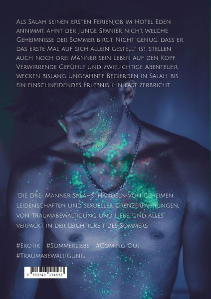 Als Salah seinen ersten Ferienjob im Hotel Eden annimmt, ahnt der junge Spanier nicht, welche Geheimnisse der Sommer birgt. Nicht genug, dass er das erste Mal auf sich allein gestellt ist, stellen auch noch drei Männer sein Leben auf den Kopf.Verwirrende Gefühle und zwielichtige Abenteuer wecken bislang ungeahnte Begierden in Salah, bis ein einschneidendes Erlebnis ihn fast zerbricht.´Die Drei Männer Salahs´ handeln von geheimen Leidenschaften und sexueller Grenzerfahrungen, von Traumabewältigung und Liebe. Und alles verpackt in der Leichtigkeit des Sommers.#Erotik #Sommerliebe #Coming Out #Traumabewältigung