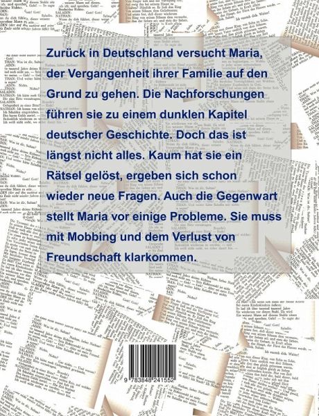 Zurück in Deutschland versucht Maria, der Vergangenheit ihrer Familie auf den Grund zu gehen. Die Nachforschungen führen sie zu einem dunklen Kapitel deutscher Geschichte. Doch das ist längst nicht alles. Kaum hat sie ein Rätsel gelöst, ergeben sich schon wieder neue Fragen. Auch die Gegenwart stellt Maria vor einige Probleme. Sie muss mit Mobbing und dem Verlust von Freundschaft klarkommen.Leseprobe:Eine furchtbare Ahnung überkam sie und sie hoffte mit jeder Faser ihres Seins, dass es nicht wahr war, weil es einfach nicht wahr sein konnte."Das ist keine Geschichte für Kinder. Ich kann sie dir nicht erzählen.""Kinder? Welche Kinder? Ich bin 15 und allmählich glaube ich, dass ich ein Recht darauf habe, es zu erfahren."