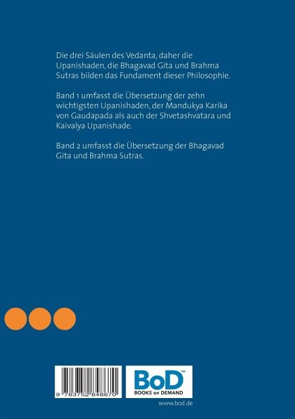 Die drei Säulen des Vedanta, daher die Upanishaden, die Bhagavad Gita und Brahma Sutras bilden das Fundament dieser Philosophie.Band 1 umfasst die Übersetzung der zehn wichtigsten Upanishaden, der Mandukya Karika von Gaudapada als auch der Shvetashvatara und Kaivalya Upanishade.Band 2 umfasst die Übersetzung der Bhagavad Gita und Brahma Sutras.