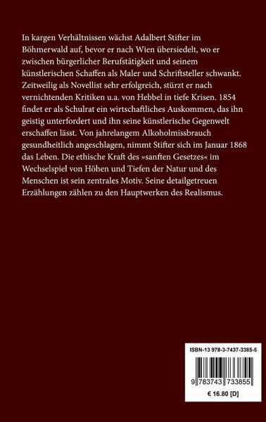 In kargen Verhältnissen wächst Adalbert Stifter im Böhmerwald auf, bevor er nach Wien übersiedelt, wo er zwischen bürgerlicher Berufstätigkeit und seinem künstlerischen Schaffen als Maler und Schriftsteller schwankt. Zeitweilig als Novellist sehr erfolgreich, stürzt er nach vernichtenden Kritiken u.a. von Hebbel in tiefe Krisen. 1854 findet er als Schulrat ein wirtschaftliches Auskommen, das ihn geistig unterfordert und ihn seine künstlerische Gegenwelt erschaffen lässt. Von jahrelangem Alkoholmissbrauch gesundheitlich angeschlagen, nimmt Stifter sich im Januar 1868 das Leben. Die ethische Kraft des "sanften Gesetzes" im Wechselspiel von Höhen und Tiefen der Natur und des Menschen ist sein zentrales Motiv. Seine detailgetreuen Erzählungen zählen zu den Hauptwerken des Realismus.