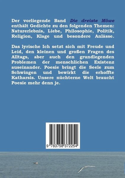 Der vorliegende Band Die dreiste Möwe enthält Gedichte zu den folgenden Themen:Naturerlebnis, Liebe, Philosophie, Politik, Religion, Klage und besondere Anlässe.Das lyrische Ich setzt sich mit Freude und Leid, den kleinen und großen Fragen des Alltags, aber auch den grundlegenden Problemen der menschlichen Existenz auseinander. Poesie bringt die Seele zum Schwingen und bewirkt die erhoffte Katharsis.Unsere nüchterne Welt braucht Poesie mehr denn je.