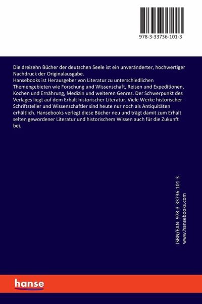 Die dreizehn Bücher der deutschen Seele ist ein unveränderter, hochwertiger Nachdruck der Originalausgabe.Hansebooks ist Herausgeber von Literatur zu unterschiedlichen Themengebieten wie Forschung und Wissenschaft, Reisen und Expeditionen, Kochen und Ernährung, Medizin und weiteren Genres. Der Schwerpunkt des Verlages liegt auf dem Erhalt historischer Literatur. Viele Werke historischer Schriftsteller und Wissenschaftler sind heute nur noch als Antiquitäten erhältlich. Hansebooks verlegt diese Bücher neu und trägt damit zum Erhalt selten gewordener Literatur und historischem Wissen auch für die Zukunft bei.