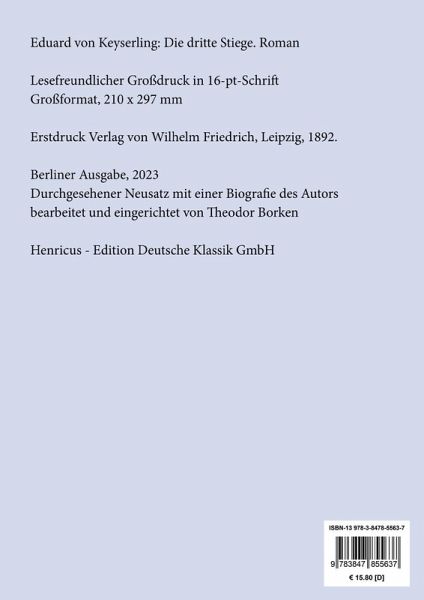 Eduard von Keyserling: Die dritte Stiege. RomanLesefreundlicher Großdruck in 16-pt-SchriftGroßformat, 210 x 297 mmBerliner Ausgabe, 2023Durchgesehener Neusatz mit einer Biografie des Autors bearbeitet und eingerichtet von Theodor BorkenErstdruck Verlag von Wilhelm Friedrich, Leipzig, 1892.Umschlagabbildung: Gustave Caillebotte, Ein Mann am Schreibtisch, 1885Gesetzt aus der Minion Pro, 16 pt.Henricus - Edition Deutsche Klassik GmbHÜber den Autor:1855 im kurländischen Tels-Paddern - heute in Lettland - als zehntes von zwölf Kindern in eine baltische Landadelsfamilie hineingeboren, studiert Eduard von Keyserling zunächst Jura in Dorpat (heute Tartu in Estland) und wechselt nach einem nie aufgeklärten Eklat und seinem Ausschluss aus der studentischen Verbindung »Curonia« nach Wien, wo er sich für Philosophie und Kunstgeschichte einschreibt und für die Wiener Allgemeine Zeitung schreibt. Zurück in Kurland widmet er sich der Verwaltung der mütterlichen Güter. Als Ende 1894 die Mutter stirbt, zieht er mit drei seiner Schwestern nach München. Der an Syphilis Erkrankte erblindet und lebt zurückgezogen in einem Haushalt mit seinen Schwestern, denen er seine Werke diktiert. Seine einfühlsame Schilderung erotischer Konflikte und die feine Ironie seiner oft adligen Figuren bringen ihm den Beinamen der »baltische Fontane« ein. Am 28. September 1918 stirbt mit Eduard von Keyserling ein bedeutender Virtuose der impressionistischen Erzählung.