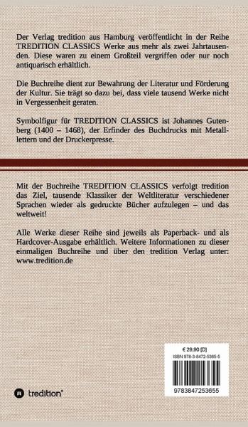 Diese Hardcover-Ausgabe ist Teil der TREDITION CLASSICS. Der Verlag tredition aus Hamburg veröffentlicht in der Buchreihe TREDITION CLASSICS Werke aus mehr als zwei Jahrtausenden. Diese waren zu einem Großteil vergriffen oder nur noch antiquarisch erhältlich. Mit TREDITION CLASSICS verfolgt tredition das Ziel, tausende Klassiker der Weltliteratur verschiedener Sprachen wieder als gedruckte Bücher zu verlegen und das weltweit! Die Buchreihe dient zur Bewahrung der Literatur und Förderung der Kultur. Sie trägt so dazu bei, dass viele tausend Werke nicht in Vergessenheit geraten.