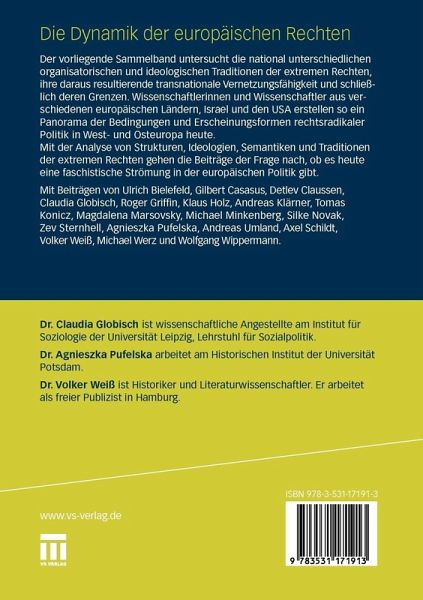 Mit Beiträgen von Ulrich Bielefeld, Gilbert Casasus, Detlev Claussen, Claudia Globisch, Roger Griffin, Klaus Holz, Andreas Klärner, Tomas Konicz, Magdalena Marsovsky, Michael Minkenberg, Silke Novak, Zev Sternhell, Agnieszka Pufelska, Andreas Umland, Axel Schildt, Volker Weiß, Michael Werz und Wolfgang Wippermann.
