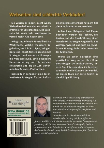 "Die effektivste online Marketing Strategie, Anleitung zum Aufbau einer E-Mail Kundenliste" ist ein Handbuch mit den neuesten Infos und Strategien zur Kundengewinnung. Sie wissen es längst, nicht wahr? Webseiten halten nicht, was die Programmierer versprechen. Eine Webseite ist heute kein Wettbewerbsvorteil mehr. Alle haben eine. Nötig sind effektiv kontrollierbare Werkzeuge, welche messbare Ergebnisse, auch in Erträgen, bringen. Dazu sind jedoch feinst abgestimmte Strategien und vernetzte Konzepte die Voraussetzung. Eine besondere Herausforderung sind die sozialen Netzwerke und die an Zahl zunehmenden Business-Plattformen. Dieses Buch behandelt eine der effektivsten Strategien für den Aufbau einer Interessentenliste mit dem Ziel diese in Kunden zu verwandeln. Anhand von Beispielen bei Kleinbetrieben werden die Technik, die Kosten und die Durchführung einer Newsletter-Strategie vorgestellt. Ein wichtiger Aspekt sind auch die rechtlichen Hintergründe beim Newsletter-Marketing.Wenn Sie einen einfachen und praktischen Weg suchen Ihre Kundenanfragen zu multiplizieren, indem Sie Interessenten im Internet sammeln und in Kunden verwandeln, ist dieses Buch der erste Schritt in die richtige Richtung.