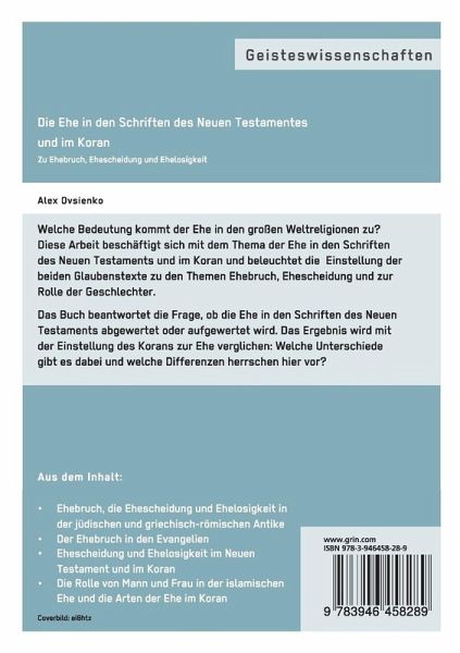 Diese Arbeit beschäftigt sich mit dem Thema der Ehe in den Schriften des Neuen Testaments und im Koran und beleuchtet die Einstellung der beiden Glaubenstexte zu den Themen Ehebruch, Ehescheidung und zur Rolle der Geschlechter.Das Buch beantwortet die Frage, ob die Ehe in den Schriften des Neuen Testaments abgewertet oder aufgewertet wird. Das Ergebnis wird mit der Einstellung des Korans zur Ehe verglichen: Welche Unterschiede gibt es dabei und welche Differenzen herrschen hier vor?Aus dem Inhalt:Ehebruch, die Ehescheidung und Ehelosigkeit in der jüdischen und griechisch-römischen Antike;Der Ehebruch in den Evangelien;Ehescheidung und Ehelosigkeit im Neuen Testament und im Koran;Die Rolle von Mann und Frau in der islamischen Ehe;Die verschiedenen Arten der Ehe im Koran.