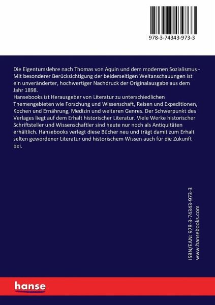 Die Eigentumslehre nach Thomas von Aquin und dem modernen Sozialismus - Mit besonderer Berücksichtigung der beiderseitigen Weltanschauungen ist ein unveränderter, hochwertiger Nachdruck der Originalausgabe aus dem Jahr 1898.