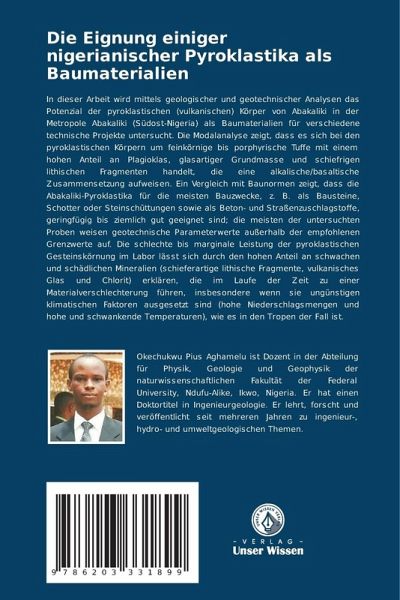 In dieser Arbeit wird mittels geologischer und geotechnischer Analysen das Potenzial der pyroklastischen (vulkanischen) Körper von Abakaliki in der Metropole Abakaliki (Südost-Nigeria) als Baumaterialien für verschiedene technische Projekte untersucht. Die Modalanalyse zeigt, dass es sich bei den pyroklastischen Körpern um feinkörnige bis porphyrische Tuffe mit einem hohen Anteil an Plagioklas, glasartiger Grundmasse und schiefrigen lithischen Fragmenten handelt, die eine alkalische/basaltische Zusammensetzung aufweisen. Ein Vergleich mit Baunormen zeigt, dass die Abakaliki-Pyroklastika für die meisten Bauzwecke, z. B. als Bausteine, Schotter oder Steinschüttungen sowie als Beton- und Straßenzuschlagstoffe, geringfügig bis ziemlich gut geeignet sind; die meisten der untersuchten Proben weisen geotechnische Parameterwerte außerhalb der empfohlenen Grenzwerte auf. Die schlechte bis marginale Leistung der pyroklastischen Gesteinskörnung im Labor lässt sich durch den hohen Anteil an schwachen und schädlichen Mineralien (schieferartige lithische Fragmente, vulkanisches Glas und Chlorit) erklären, die im Laufe der Zeit zu einer Materialverschlechterung führen, insbesondere wenn sie ungünstigen klimatischen Faktoren ausgesetzt sind (hohe Niederschlagsmengen und hohe und schwankende Temperaturen), wie es in den Tropen der Fall ist.