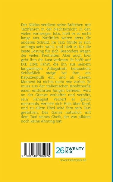 Der Niklas verdient seine Brötchen mit Taxifahren in der Nachtschicht. In den vielen vorherigen Jobs, hielt er es nicht lange aus. Natürlich waren stets die anderen schuld. Im Taxi fühlte er sich anfangs sehr wohl, und hielt es für die beste Lösung für sich. Besonders wegen der vielen Freiheiten. Aber auch hier geht ihm die Lust verloren. Er hofft auf DIE EINE Fahrt, die ihn aus seinem langweiligen Alltagstrott herausholt. Schließlich steigt bei ihm ein Kapuzenpulli ein, und ab diesem Moment ist nichts mehr wie vorher. Er muss aus der italienischen Kreditmafia einen entführten Jungen befreien, wird an der Grenze verhaftet und verhört, seinen Fahrgast verliert er gleich mehrmals, verliebt sich Hals über Kopf, und zu allem Übel wird ihm sein Taxi gestohlen. Das Ganze natürlich mit dem Taxi seines Chefs, der von all dem noch keine Ahnung hat.