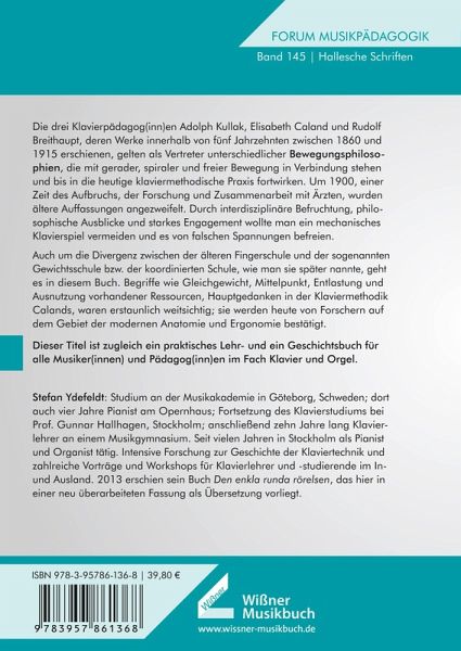 Die drei Klavierpädagog(inn)en Adolph Kullak, Elisabeth Caland und Rudolf Breithaupt, deren Werke innerhalb von fünf Jahrzehnten zwischen 1860 und 1915 erschienen, gelten als Vertreter unterschiedlicher Bewegungsphilosophien, die mit gerader, spiraler und freier Bewegung in Verbindung stehen und bis in die heutige klaviermethodische Praxis fortwirken. Um 1900, einer Zeit des Aufbruchs, der Forschung und Zusammenarbeit mit Ärzten, wurden ältere Auffassungen angezweifelt. Durch interdisziplinäre Befruchtung, philosophische Ausblicke und starkes Engagement wollte man ein mechanisches Klavierspiel vermeiden und es von falschen Spannungen befreien.Auch um die Divergenz zwischen der älteren Fingerschule und der sogenannten Gewichtsschule bzw. der koordinierten Schule, wie man sie später nannte, geht es in diesem Buch. Begriffe wie Gleichgewicht, Mittelpunkt, Entlastung und Ausnutzung vorhandener Ressourcen, Hauptgedanken in der Klaviermethodik Calands, waren erstaunlich weitsichtig; sie werden heute von Forschern auf dem Gebiet der modernen Anatomie und Ergonomie bestätigt. Der Titel ist zugleich ein praktisches Lehr- und ein Geschichtsbuch für alle Musiker(innen) und Pädagog(inn)en im Fach Klavier und Orgel.