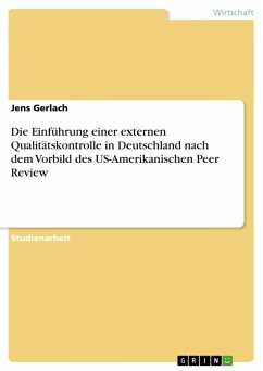 Studienarbeit aus dem Jahr 2003 im Fachbereich BWL - Rechnungswesen, Bilanzierung, Steuern, Note: 1,3, HAWK Hochschule für angewandte Wissenschaft und Kunst - Fachhochschule Hildesheim, Holzminden, Göttingen (Lehrstuhl Rechnungslegung und Prüfungswesen), Veranstaltung: Prüfungswesen, Sprache: Deutsch, Abstract: Die globale Ausrichtung moderner Dienstleistungsunternehmen und die zunehmende Internationalisierung der sich entwickelnden Märkte erfordern in hohem Maße eine Evolution der Qualität der Abschlussprüfungen: einerseits um den Anforderungen ausländischer Märkte und Börsen gerecht zu werden, andererseits aber auch um den Bestrebungen der Europäischen Union nach Harmonisierung der Prüfungsleistungen in Europa zu entsprechen. Dabei gewinnt die Transparenz der Prüfungsleistung an sich eminente Bedeutung - gerade vor dem Hintergrund aktueller Unternehmenskrisen und der einhergehenden Diskussion um die Qualität der Abschlussprüfungen. Mit Wirkung zum 01.01.2001 wurde in Deutschland eine externe Qualitätskontrolle im Bereich der Wirtschaftsprüfung auf gesetzlicher Ebene eingeführt, die die Qualität der Abschlussprüfungen sicherstellen soll. Die Ausgestaltung richtete sich nach dem zu diesem Zeitpunkt gültigen Verfahren des US-amerikanischen Peer Review , der aber aktuell gerade einer Neustrukturierung unterzogen wird.Das Ziel dieser Hausarbeit besteht darin, die Notwendigkeit, die zeitliche Entwicklung sowie die Ausgestaltung dieser externen Qualitätskontrolle im Vergleich zum amerikanischen Peer Review darzulegen. Der Schwerpunkt liegt auf der Darstellung der deutschen Qualitätskontrolle Desweiteren werden Vergleiche zur ursprünglichen Version des Peer Review angestellt. Im Verlauf der Arbeit werden dann aber auch aktuelle Entwicklungen und die sich ergebenden Konsequenzen aufgezeigt.