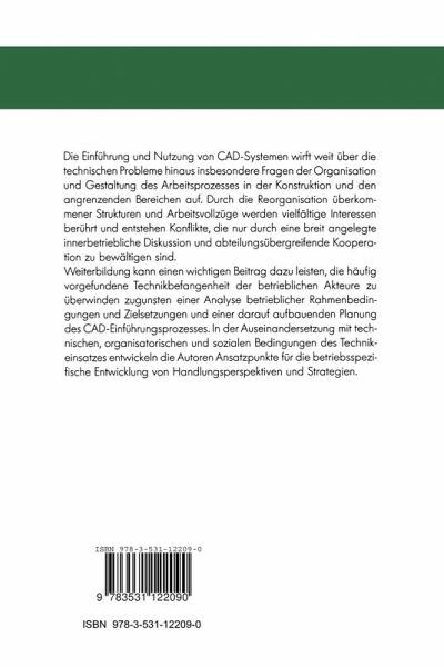 Die Einführung und Nutzung von CAD-Systemen wirft weit über die technischen Probleme hinaus insbesondere Fragen der Organisation und Gestaltung des Arbeitsprozesses in der Konstruktion und den angrenzenden Bereichen auf. Durch die Reorganisation überkommener Strukturen und Arbeitsvollzüge werden vielfältige Interessen berührt und entstehen Konflikte, die nur durch eine breit angelegte innerbetriebliche Diskussion und abteilungsübergreifende Kooperation zu bewältigen sind.Weiterbildung kann einen wichtigen Beitrag dazu leisten, die häufig vorgefundene Technikbefangenheit der betrieblichen Akteure zu überwinden zugunsten einer Analyse betrieblicher Rahmenbedingungen und Zielsetzungen und einer darauf aufbauenden Planung des CAD-Einführungspozesses.
