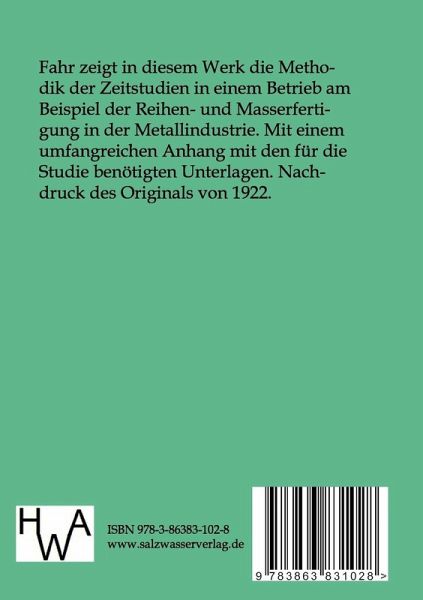 Fahr zeigt in diesem Werk die Methodik der Zeitstudien in einem Betrieb am Beispiel der Reihen- und Masserfertigung in der Metallindustrie. Mit einem umfangreichen Anhang mit den für die Studie benötigten Unterlagen. Nachdruck des Originals von 1922.