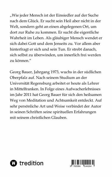 Georg Bauer wurde 1973 in Regensburg geboren und wuchs in der südlichen Oberpfalz auf. Nach seinem Studium an der Universität Regensburg arbeitet Georg Bauer heute als Lehrer in Mittelfranken. Über mich: "Seit meiner Kindheit litt ich - ohne mir dessen bewusst zu sein - an einer schweren Angststörung, die mit Zwängen und Depressionen einherging. Nach einem persönlichen Aufwacherlebnis im Jahr 2011, in dessen Zuge bei mir eine bipolare Störung festgestellt wurde, habe ich für mich den spirituellen Weg der Achtsamkeit entdeckt. Obwohl bipolare Störungen wohl nicht vollkommen heilbar sind, ist es mir durch die Kraft des achtsamen Atmens mittlerweile gelungen, meine psychische Gesundheit weitgehend in den Griff zu bekommen." "Es ist mir ein Anliegen, freimütig über meine psychische Leidens- und Heilungsgeschichte ebenso wie über meine spirituellen und religiösen Erfahrungen zu schreiben. Dabei möchte ich meinen Leserinnen und Lesern tiefe Einblicke in meine Gedankenwelt gewähren. Besonders wichtig ist es mir, anderen Menschen, die ebenfalls unter psychischen Störungen leiden, Mut zu machen und Wege der Heilung aufzuzeigen. Da sich diese große Nähe und Offenheit schlecht mit meiner Stellung als Lehrer verträgt, habe ich das Pseudonym Georg Bauer gewählt." "Der spirituelle Weg von Meditation und Achtsamkeit ist für mich mittlerweile zum Lebensweg geworden. Als gläubiger Christ mit römisch-katholischem Bekenntnis möchte ich meine spirituellen Praktiken dabei stets vor dem Hintergrund meines christlichen Glaubens darstellen. Meine Texte richten sich aber nicht ausschließlich an religiöse Menschen. Meditation und Achtsamkeit sind für mich universelle spirituelle Praktiken, die an keine Religion oder Weltanschauung gebunden sind. Grundsätzlich möchte ich meine Leserinnen und Leser ganz praktisch, lebensnah und anschaulich dazu einladen, die eigene Spiritualität zu entdecken, um so zufriedener und glücklicher leben zu können."