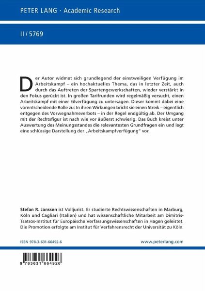 Der Autor widmet sich grundlegend der einstweiligen Verfügung im Arbeitskampf - ein hochaktuelles Thema, das in letzter Zeit, auch durch das Auftreten der Spartengewerkschaften, wieder verstärkt in den Fokus gerückt ist. In großen Tarifrunden wird regelmäßig versucht, einen Arbeitskampf mit einer Eilverfügung zu untersagen. Dieser kommt dabei eine vorentscheidende Rolle zu: In ihren Wirkungen bricht sie einen Streik - eigentlich entgegen des Vorwegnahmeverbots - in der Regel endgültig ab. Der Umgang mit der Rechtsfigur ist nach wie vor äußerst schwierig. Das Buch kreist unter Auswertung des Meinungsstandes die relevantesten Grundfragen ein und legt eine schlüssige Darstellung der "Arbeitskampfverfügung" vor.