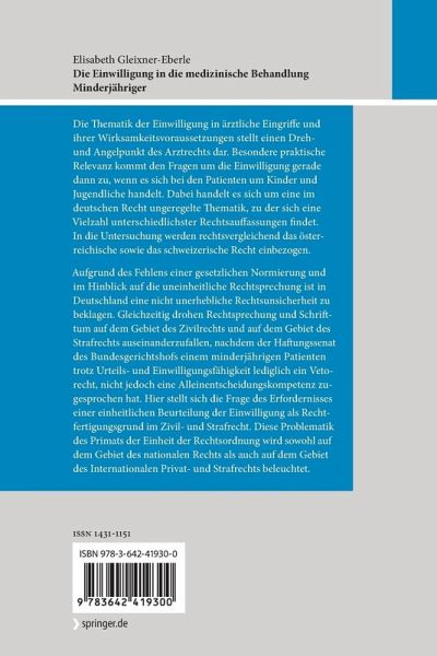 Das Werk beschäftigt sich mit der Einwilligung in die medizinische Behandlung von Minderjährigen. Die Thematik der Einwilligung in ärztliche Eingriffe und ihrer Wirksamkeitsvoraussetzungen stellt einen Dreh- und Angelpunkt des Arztrechts dar. Besondere praktische Relevanz kommt den Fragen um die Einwilligung gerade dann zu, wenn es sich bei den Patienten um Kinder und Jugendliche handelt. Dabei handelt es sich um eine im deutschen Recht ungeregelte Thematik, auf dem sich eine Vielzahl unterschiedlichster Rechtsauffassungen finden. In die Untersuchung werden rechtsvergleichend das österreichische sowie das schweizerische Recht einbezogen.