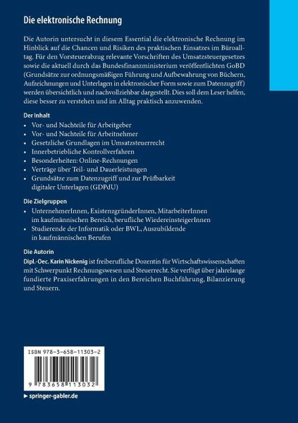 Die Autorin untersucht in diesem Essential die elektronische Rechnung im Hinblick auf die Chancen und Risiken des praktischen Einsatzes im Büroalltag. Für den Vorsteuerabzug relevante Vorschriften des Umsatzsteuergesetzes sowie die aktuell durch das Bundesfinanzministerium veröffentlichten GoBD (Grundsätze zur ordnungsmäßigen Führung und Aufbewahrung von Büchern, Aufzeichnungen und Unterlagen in elektronischer Form sowie zum Datenzugriff) werden übersichtlich und nachvollziehbar dargestellt. Dies soll dem Leser helfen, diese besser zu verstehen und im Alltag praktisch anzuwenden.
