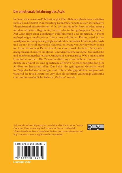 In dieser Open-Access-Publikation gibt Klaus Behnam Shad einen vertieften Einblick in die (Selbst-)Unterwerfung Geflüchteter und fokussiert ihre affektive Identitätsneukonstruktionen, d. h. die individuelle Auseinandersetzung mit dem affektiven Regime Asyl seitens der in ihm gefangenen Menschen. Auf Grundlage einer einjährigen Feldforschung und empirisch, in Form mehrphasiger explorativer Interviews erhobener Daten, wird in der sozialphänomenologisch angelegten Studie die emotionale Erfahrung des Asyls und die mit ihr einhergehende Neupositionierung von Asylbewerber_innen im Ankunftskontext Deutschland aus einer postkolonialen Perspektive nachgezeichnet, indem emotions- und identitätstheoretische, feministische und anerkennungstheoretische Ansätze auf eine neuartige Weise miteinander kombiniert werden. Die Zusammenführung verschiedener theoretischer Bausteine erlaubt es, eine spezifische affektive Anerkennungsfindung im Asylkontext herauszustellen: Das Selbst des gefangenen Menschen wird im Zuge der Inferiorisierungs- und Unterwerfungspraktiken umgemünzt, wahrend die totale Institution Asyl ihm als Identitats-Zuteilungs-Maschine eine unmissverstandliche Rolle als "Verlierer" zuweist.