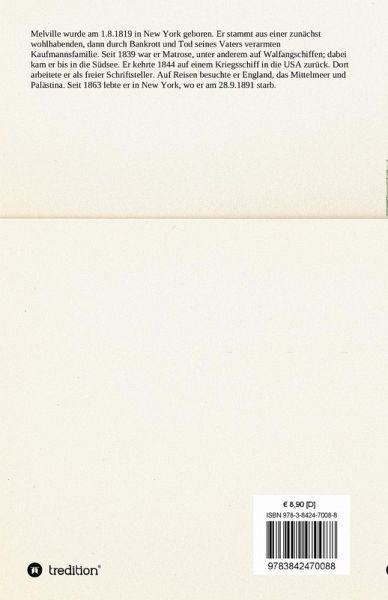 Herman Melville (1819-91) stammte aus einer verarmten New Yorker Familie. Er ging früh zur See und verdingte sich als Matrose, unter anderem auch auf Walfängern. Seine Reisen führten ihn bis in die Südsee. 1844 kehrte er in die USA zurück, lebte als freier Schriftsteller und war von 1866-85 als Zollinspektor in New York tätig. Der Romancier und Autor von Kurzgeschichten und Lyrik gilt als einer der bedeutendsten amerikanischen Schriftsteller. Sein Meisterwerk 'Moby Dick' zählt zu den Klassikern der Weltliteratur.