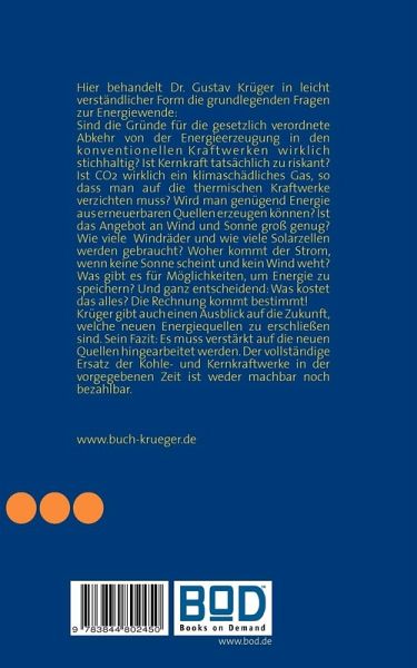 Dr. Gustav Krüger behandelt in diesem Buch in leicht verständlicher Form die grundlegenden Fragen zur Energiewende:Sind die Gründe für die gesetzlich verordnete Abkehr von der Energieerzeugung in konventionellen Kraftwerken wirklich stichhaltig? Ist Kernkraft tatsächlich zu riskant? Ist CO2 wirklich ein klimaschädliches Gas, so dass man auf die thermischen Kraftwerke verzichten muss? Wird man genügend Energie aus erneuerbaren Quellen erzeugen können? Ist das Angebot an Wind und Sonne groß genug? Wie viele Windräder und wie viele Solarzellen werden gebraucht? Woher kommt der Strom, wenn keine Sonne scheint und kein Wind weht? Was gibt es für Möglichkeiten, um Energie zu speichern? Und ganz entscheidend: Was kostet das alles? Die Rechnung kommt bestimmt!Krüger gibt auch einen Ausblick auf die Zukunft, welche neuen Energiequellen zu erschließen sind. Sein Fazit: Es muss verstärkt auf die neuen Quellen hingearbeitet werden. Der vollständige Ersatz der Kohle- und Kernkraftwerke in der vorgegebenen Zeit ist weder machbar noch bezahlbar.
