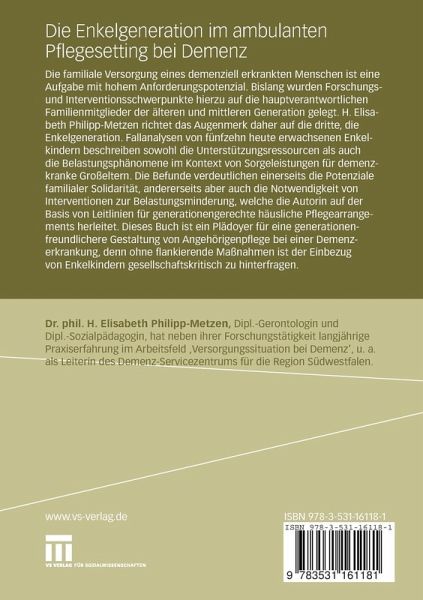Die familiale Versorgung eines demenziell erkrankten Menschen ist eine Aufgabe mit hohem Anforderungspotenzial. Bislang wurden Forschungs- und Interventionsschwerpunkte hierzu auf die hauptverantwortlichen Familienmitglieder der älteren und mittleren Generation gelegt. H. Elisabeth Philipp-Metzen richtet das Augenmerk daher auf die dritte, die Enkelgeneration. Fallanalysen von fünfzehn heute erwachsenen Enkelkindern beschreiben sowohl die Unterstützungsressourcen als auch die Belastungsphänomene im Kontext von Sorgeleistungen für demenzkranke Großeltern. Die Befunde verdeutlichen einerseits die Potenziale familialer Solidarität, andererseits aber auch die Notwendigkeit von Interventionen zur Belastungsminderung, welche die Autorin auf der Basis von Leitlinien für generationengerechte häusliche Pflegearrangements herleitet. Dieses Buch ist ein Plädoyer für eine generationenfreundlichere Gestaltung von Angehörigenpflege bei einer Demenzerkrankung, denn ohne flankierende Maßnahmen ist der Einbezug von Enkelkindern gesellschaftskritisch zu hinterfragen.