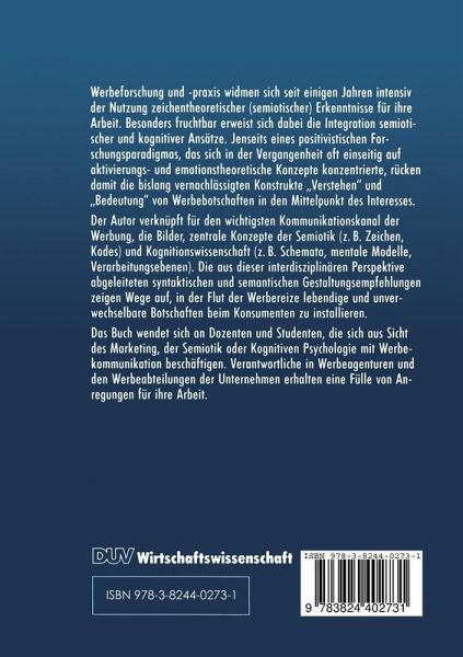 Der Autor verknüpft für den wichtigsten Kommunikationskanal der Werbung, die Bilder, zentrale Konzepte der Semiotik (z. B. Zeichen, Kodes) und der Kognitionswissenschaft (z. B. Schemata, mentale Modelle, Verarbeitungsebenen).