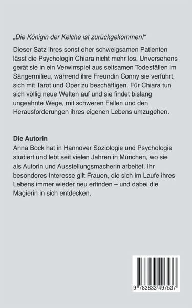 "Die Königin der Kelche ist zurückgekommen!" Dieser Satz ihres sonst eher schweigsamen Patienten lässt die Psychologin Chiara nicht mehr los. Unversehens gerät sie in ein Verwirrspiel aus seltsamen Todesfällen im Sängermilieu, während ihre Freundin Conny sie verführt, sich mit Tarot und Oper zu beschäftigen. Für Chiara tun sich völlig neue Welten auf und sie findet bislang ungeahnte Wege, mit schweren Fällen und den Herausforderungen ihres eigenen Lebens umzugehen.