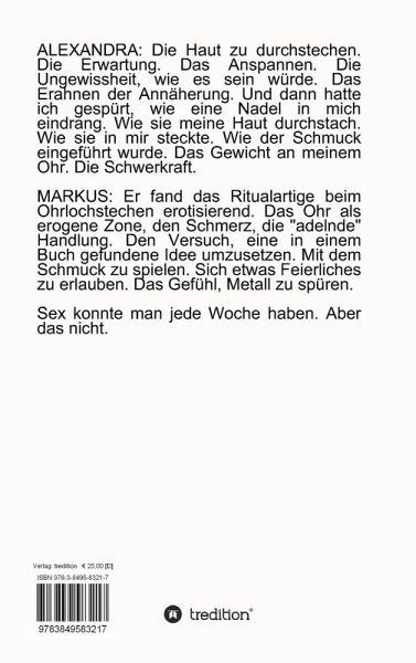 ALEXANDRA: Die Haut zu durchstechen. Die Erwartung. Das Anspannen. Die Ungewissheit, wie es sein würde. Das Erahnen der Annäherung. Und dann hatte ich gespürt, wie eine Nadel in mich eindrang. Wie sie meine Haut durchstach. Wie sie in mir steckte. Wie der Schmuck eingeführt wurde. Das Gewicht an meinem Ohr. Die Schwerkraft.