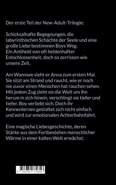 Der erste Teil der New-Adult-Trilogie: Schicksalhafte Begegnungen, die labyrinthischen Schächte der Seele und eine große Liebe bestimmen Boys Weg. Ein Antiheld von oft heldenhafter Entschlossenheit, doch so zerrissen wie unsere Zeit. Am Wannsee sieht er Anna zum ersten Mal. Sie sitzt am Strand und raucht, wie er noch nie zuvor einen Menschen hat rauchen sehen. Mit jedem Zug zieht sie die Welt um ihn herum in sich hinein, verschlingt sie tiefer und tiefer. Boy verliebt sich. Doch ihr Kennenlernen gestaltet sich nicht einfach und wird zur emotionalen Achterbahnfahrt. Eine magische Liebesgeschichte, deren Stärke aus dem Fortbestehen menschlicher Wärme in einer kalten Welt erwächst.