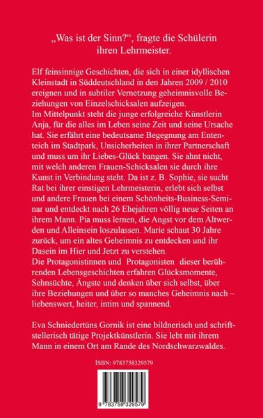 "Die Enten im Teich - Geschichten von Frauen und anderen Geheimnissen"- ist ein Roman mit elf feinsinnigen Geschichten, die sich in einer idyllischen Kleinstadt in Süddeutschland in den Jahren 2009 / 2010 ereignen und in subtiler Vernetzung geheimnisvolle Beziehungen von Einzelschicksalen aufzeigen. Im Mittelpunkt steht die junge erfolgreiche Künstlerin Anja Kaahl, für die alles im Leben seine Zeit und seine Ursache hat. Sie erfährt eine bedeutsame Begegnung am Ententeich im Stadtpark, Unsicherheiten in ihrer Partnerschaft und muss um ihr Liebesglück bangen. Sie ahnt nicht, mit welch anderen Frauen-Schicksalen sie durch ihre Kunst in Verbindung steht. Da ist z. B. Sophie. Sie sucht Rat bei ihrer einstigen Lehrmeisterin, erlebt sich selbst und andere Frauen bei einem Schönheits-Business-Seminar und entdeckt nach 26 Ehejahren völlig neue Seiten an ihrem Mann. Pia muss lernen, die Angst vor dem Altwerden und Alleinsein anzunehmen und loszulassen. Marie schaut 30 Jahre zurück, um ihrDasein im Hier und Jetzt zu verstehen. Die mitten im Leben stehenden Protagonistinnen und Protagonisten dieser berührenden Lebensgeschichten erfahren Glücksmomente, Sehnsüchte, Ängste und denken über sich selbst, über ihre Beziehungen und über so manches Geheimnis nach - liebenswert, heiter, intim und spannend. Eva Schniedertüns Gornik greift in jeder ihrer Erzählungen ein anderes Thema auf, dass so oder ähnlich jeden betreffen kann. Dazu zählen das Älterwerden, die Einsamkeit oder Probleme in der Partnerschaft. All diesen Facetten des menschlichen Daseins widmet sich die Autorin auf eine humorvolle und ermunternde Schreibweise. Oder, wie die Kunsthistorikerin und Autorin Karin Jäckel meint: "Mit etlichen Überraschungseffekten und viel Einfühlungsvermögen, aber auch mit Ortskolorit und Sprachwitz ist eine ansprechende Erzählung gelungen. Sie rundet den Band vergnüglich ab, sodass man ihn mit einem Schmunzeln aus der Hand legt." Der Roman richtet sich an Leserinnen ab 30 Jahren, die, wie die Charaktere im Roman, mitten im Leben stehen.