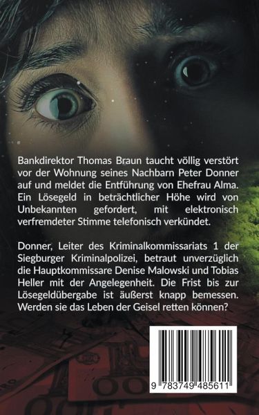 Bankdirektor Thomas Braun taucht völlig verstört vor der Wohnung seines Nachbarn Peter Donner auf und meldet die Entführung von Ehefrau Alma. Ein Lösegeld in beträchtlicher Höhe wird von Unbekannten gefordert, mit elektronisch verfremdeter Stimme telefonisch verkündet. Donner, Leiter des Kriminalkommissariats 1 der Siegburger Kriminalpolizei, betraut unverzüglich die Hauptkommissare Denise Malowski und Tobias Heller mit der Angelegenheit. Die Frist bis zur Lösegeldübergabe ist äußerst knapp bemessen. Werden sie das Leben der Geisel retten können?