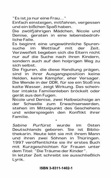 "Es ist ja nur eine Frau ..." Einfach einsteigen, mitfahren, vergessen und ein bißchen Spaß haben. Die zwölfjährigen Mädchen, Nicole und Denise, geraten in eine lebensbedrohliche Falle. Es beginnt eine ungewöhnliche Spurensuche im Wettlauf mit der Zeit. Verzweifelt begeben sich die Eltern nicht nur auf die Suche nach ihren Kindern, sondern auch auf den holprigen Weg zu sich selbst. Die Figuren, die diese Handlung prägen, sind in ihrer Ausgangsposition keine Helden, keine Kämpfer, eher Versagen. Die Wende in der DDR, für sie ein Stoß ins kalte Wasser, zeigt Wirkung. Das scheinbar intakte Familienleben bröckelt oder gerät aus den Fugen. Nicole und Denise, zwei Halbwüchsige an der Schwelle zum Erwachsenwerden, stehen im Mittelpunkt des Geschehens und widerspiegeln den Konflikt ihrer Familie.