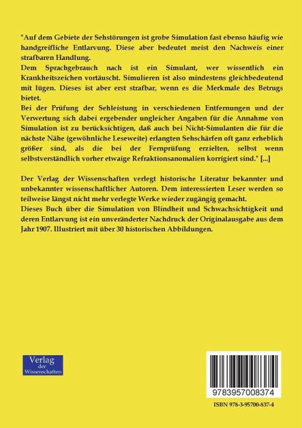 Dieses Buch über die Simulation von Blindheit und Schwachsichtigkeit und deren Entlarvung ist ein unveränderter Nachdruck der Originalausgabe aus dem Jahr 1907. Illustriert mit über 30 historischen Abbildungen.