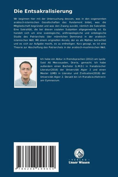 Wir beginnen hier mit der Untersuchung dessen, was in den sogenannten arabisch-islamischen Gesellschaften das Fundament bildet, was die Mitgliedschaft begründet und was den Zwang ausübt, nämlich die Sakralität. Eine Sakralität, die bei diesen sozialen Subjekten allgegenwärtig ist. Es handelt sich um eine soziologische, anthropologische und ontologische Studie des Patriarchats (der männlichen Dominanz) in der arabisch-islamischen Welt. Mit einem originellen Ansatz, der es als Mythos betrachtet und es sich zur Aufgabe macht, es zu entheiligen. Kurz gesagt, es ist eine Theorie zur Abschaffung des Patriarchats in der arabisch-muslimischen Welt.
