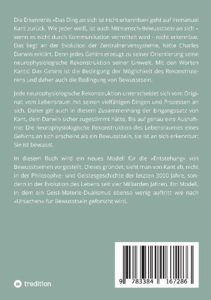 Die Erkenntnis »Das Ding an sich ist nicht erkennbar« geht auf Immanuel Kant zurück. Wie jeder weiß, ist auch Mitmensch-Bewusstsein an sich - wenn es nicht durch Kommunikation vermittelt wird - nicht erkennbar. Das liegt an der Evolution der Zentralnervensysteme, hätte Charles Darwin erklärt. Denn jedes Gehirn erzeugt zu seiner Orientierung seine neurophysiologische Rekonstruktion seiner Umwelt. Mit den Worten Kants: Das Gehirn ist die Bedingung der Möglichkeit des Rekonstruierens und daher auch die Bedingung von Bewusstsein.Jede neurophysiologische Rekonstruktion unterscheidet sich vom Original: vom Lebensraum mit seinen vielfältigen Dingen und Prozessen an sich. Daher gilt auch in diesem Zusammenhang der Eingangssatz von Kant, dem Darwin sicher zugestimmt hätte. Bis auf genau eine Ausnahme: Die neurophysiologische Rekonstruktion des Lebensraumes eines Gehirns an sich erscheint als ein Bewusstsein, sie ist an sich erkennbar: Sie ist bewusst.In diesem Buch wird ein neues Modell für die »Entstehung« von Bewusstseinen vorgestellt. Dieses gründet, sieht man von Kant ab, nicht in der Philosophie- und Geistesgeschichte der letzten 3000 Jahre, sondern in der Evolution des Lebens seit vier Milliarden Jahren. Ein Modell, in dem ein Geist-Materie-Dualismus ebenso wenig auftritt wie nach »Ursachen« für Bewusstsein geforscht wird.Weiteres: www.bewusst-wie.eu
