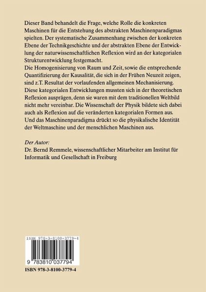 Das Buch stellt die Frage, welche Rolle die konkreten Maschinen für die Entstehung des abstrakten Maschinenparadigmas spielten.Der systematische Zusammenhang zwischen der konkreten Ebene der Technikgeschichte und der abstrakten Ebene der Entwicklung der naturwissenschaftlichen Reflexion wird an der kategorialen Strukturentwicklung festgemacht. Die Homogenisierung von Raum und Zeit, sowie die entsprechende Quantifizierung der Kausalität, die sich in der Frühen Neuzeit zeigen, sind z.T. Resultat der vorlaufenden allgemeinen Mechanisierung. Diese kategorialen Entwicklungen mussten sich in der theoretischen Reflexion ausprägen, denn sie waren mit dem traditionellen Weltbild nicht mehr vereinbar. Die Wissenschaft der Physik bildet sich dabei auch als Reflexion auf die veränderten kategorialen Formen aus. Und das Maschinenpradigma drückt so die physikalische Identität der Weltmaschine und der menschlichen Maschinen aus.