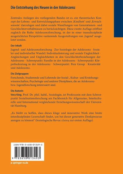Jugend- und Adoleszenzforschung.- Zur Soziologie der Adoleszenz.- Sozialer und individueller Wandel: Individualisierung und soziale Ungleichheit.- Angleichungen und Ungleichheiten in den Geschlechterbeziehungen der Adoleszenz.- Schwerpunkt: Familie in der Adoleszenz.- Schwerpunkt: Körperbedeutung in der Adoleszenz.- Schwerpunkt: Peer Group.- Kreativität und Adoleszenz.